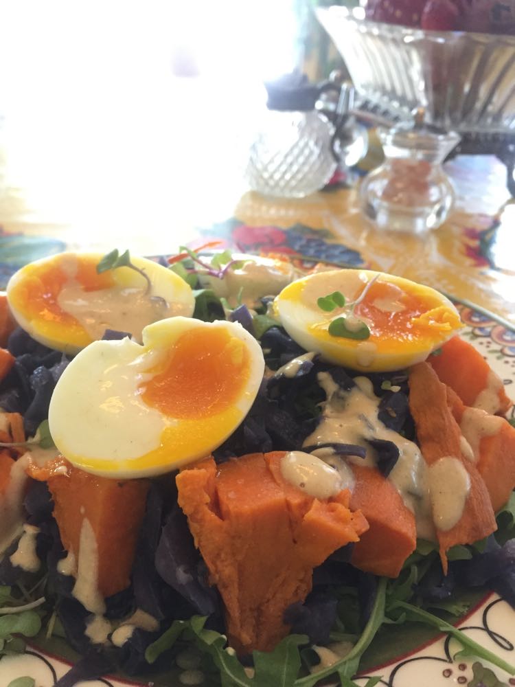 Arugula, sprouts, roasted yam, braised cabbage, six-minute eggs,