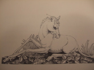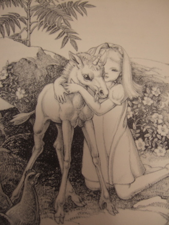 " 'But if a young maiden,' " her mother read on, " 'seat herself beneath a tree, the Unicorn does forget his fierceness and become as gentle toward her as a pet Hind. Approaching the maiden, he kneels and lays his head in her lap, and there sleeps.' "