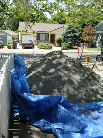 Here is our new sand, the correct kind from Wheeler Zamaroni (the wrong kind came from another source). The correct kind is called "concrete sand" and has rough edges, drains well, rolls easily under the stones you are placing, and lock into each other when water is added to the pressing around the stones you are placing...