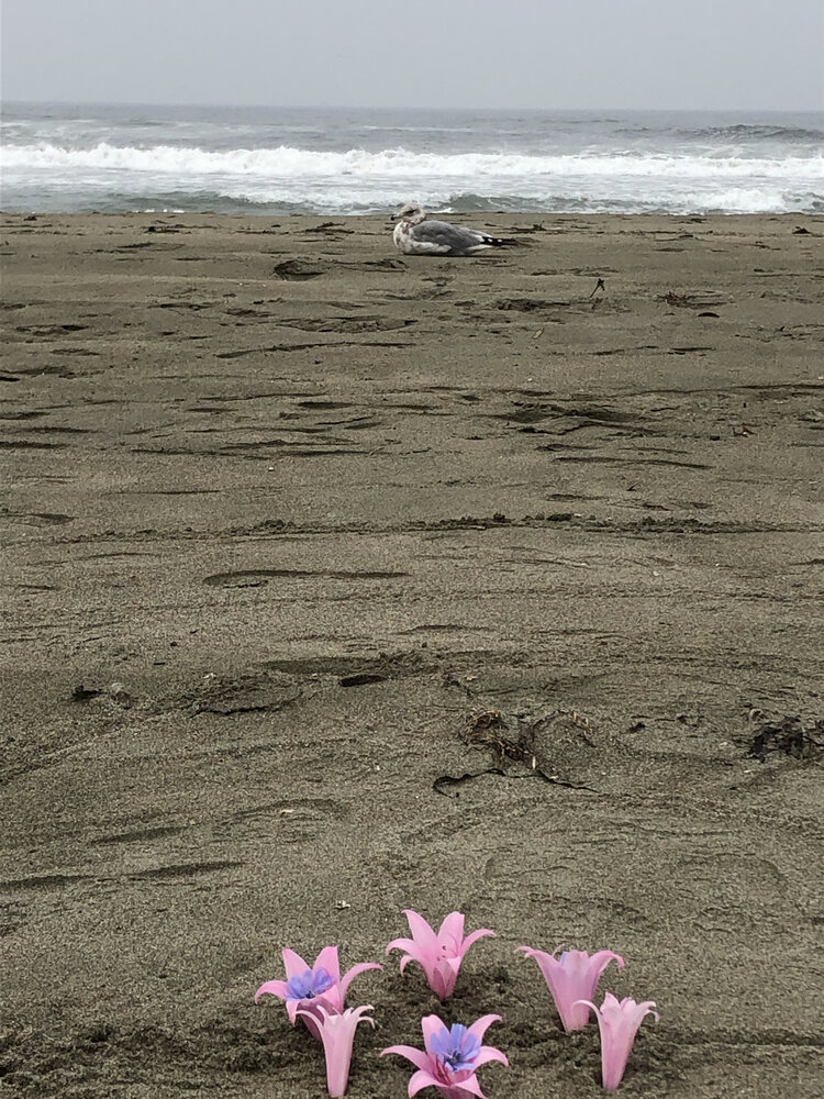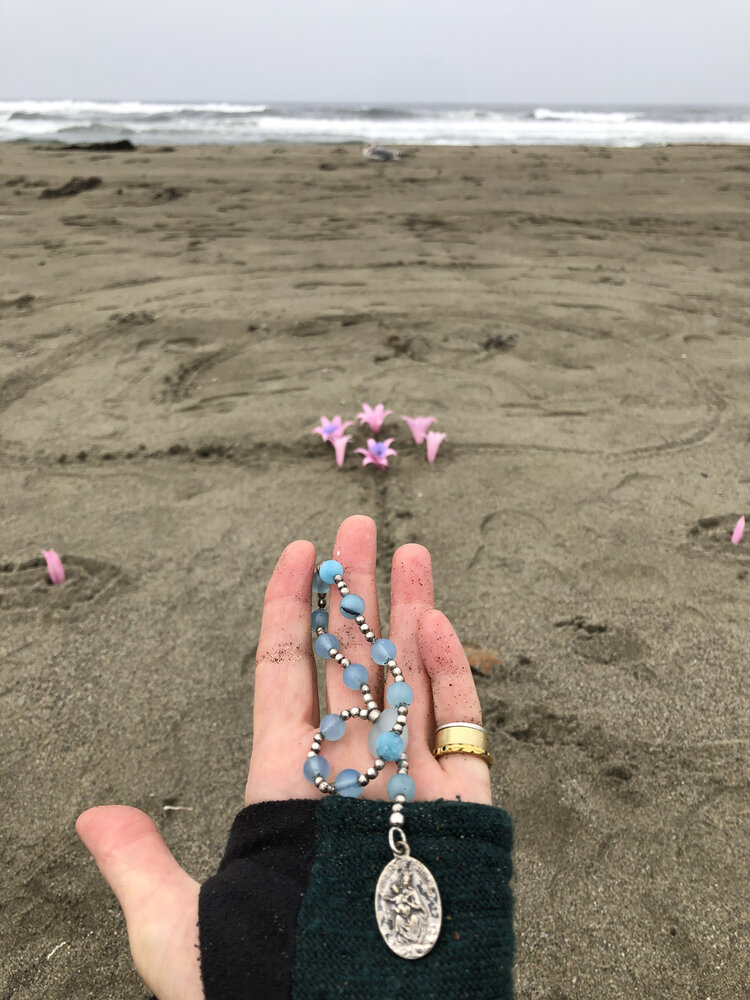 Stella Maris Chaplet and Common Chicory (blue) and Belladonna Lily (pink)